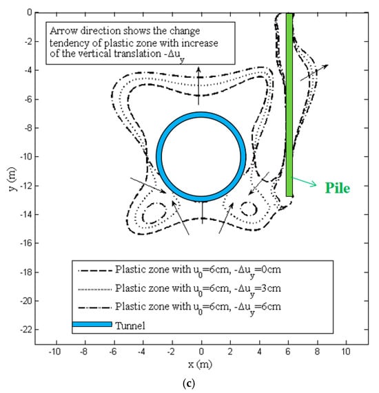 Figure 7c shows an example of the impact of three distinct vertical translation magnitudes (Δuy = 0 cm, −3 cm, and −6 cm) on the contours of the potential plastic zone created by tunneling. The form of the prospective plastic region appears to grow towards a fan shape since it is observed that when the vertical translation increases, the potential plastic region’s down side closes inward and its up side expands outward. This is a result of the potential plastic region’s upward expansion expanding outward. It should be noted that the uniform convergence of a tunnel mostly affects the range of the potential plastic zone, whereas ovalization of a tunnel primarily affects its shape. The vertical translation affects both the form and range of the possible plastic zone.