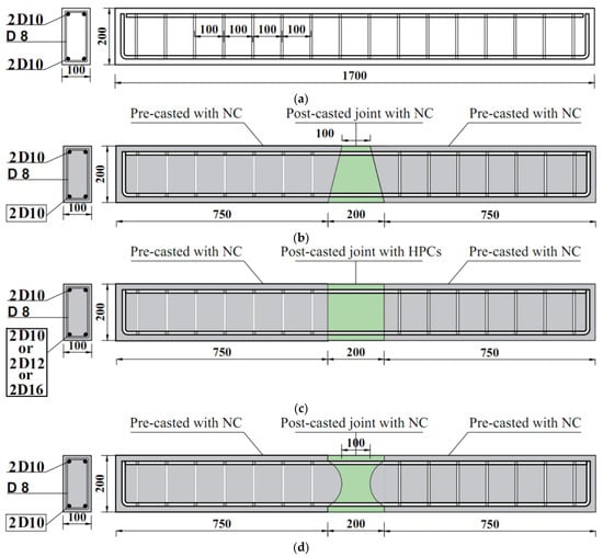 A total of 11 precast rectangular reinforced concrete (PRRC) beams were tested to failure, including 1 normal concrete (NC) beam (B0) that served as a control specimen for comparison purposes. The configurations of the beams are illustrated in Figure 1, and detailed specifications are provided in Table 1. Each beam had a total length of 1700 mm, comprising two precast sections, each 750 mm long, with an intermediate connection length of 200 mm. The cross-sectional dimensions of the PRRC specimens were 100 mm × 200 mm. For specimens in Group G-N, two ɸ10 mm reinforcement bars were utilized in both the compression and tension regions. In other groups, the tensile reinforcement bar diameters were varied (10 mm, 12 mm, or 16 mm) to assess the effects of bar diameter on the intermediate connection’s performance (see Table 1). In addition, ɸ8 mm bars were used as stirrups, spaced at 100 mm intervals. The PRRC specimens featured three different shapes for the intermediate connections: triangular, rectangular, and semi-circular, designated as models B, C, and D, respectively (see Table 1). The control specimen configuration was referred to as model A. Intermediate connections were filled with various types of concrete, including NC, engineered cementitious composites (ECC), ultra-high-performance ECC (UHPECC), and rubberized ECC (RECC). In the naming convention of the groups, the letter following ‘G’ indicates the type of infill concrete (e.g., G-N for NC, G-U for UHPECC, G-E for ECC, and G-RE for RECC). The number following the letter represents the effects of the tensile reinforcement bar diameter on the length of the construction joint measured in the flexural zone (Lc). A rectangular-shaped intermediate connection is expected to provide the most resistance under load, whereas triangular- and semi-circular-shaped intermediate connections offer savings in the cost of casting materials, due to the smaller surface area to be cast, yet these may still provide performance close to a rectangular-shaped intermediate connection. The different types of infill concrete used in this study offer a unique understanding of their contribution to the flexural performance of PRRC beams, owing to their distinguishing characteristics.