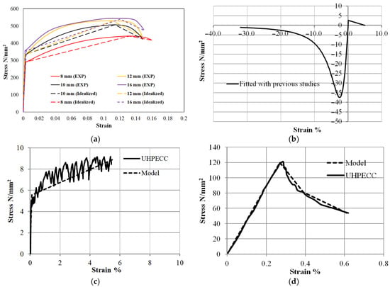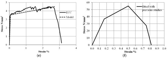 Accurate materials laws are important for the accuracy of numerical modeling. For NC, the established compressive stress–strain relationship proposed by Carreira and Chu [], as shown in Figure 2b and Equations (1)–(3), was used to calculate the stress–strain curves. Conversely, the stress–strain relationships proposed by Ge et al. [] for UHPECC and ECC were calibrated with experimental results presented in Figure 2c,e. Moreover, the stress–strain relationship developed by Aslani [] was employed to simulate the behavior of RECC, and Equations (4)–(9) were used to determine the full stress–strain relationship. A bi-linear elastic-plastic behavior model with hardening (Figure 2a) was utilized to represent the steel reinforcement bars and stirrups.