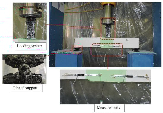 The experimental testing was conducted in the structures laboratory at Kafrelsheikh University, Egypt. The specimens were subjected to a three-point bending test with pin–pin end conditions, ensuring the accurate simulation of bending stresses. Each specimen was placed in the loading frame with a 50 mm overhang on either end. A hydraulic machine with a capacity of 500 kN was utilized to apply the load incrementally. The displacement at the mid-span of the specimen was measured using a linear variable displacement transducer (LVDT), which provided precise data on the specimen’s deformation. To monitor crack development in the intermediate connection region, two electrical pi-gauges were strategically installed. This setup allowed for the detailed observation and measurement of crack propagation during testing. The load was increased at a controlled rate of 5 kN/min, ensuring a gradual application of stress to the specimen. A data logger system was employed to continuously record all relevant data throughout the test. Cracks were marked as they appeared, and observations continued until the specimen ultimately failed. Figure 4 provides a visual representation of the test setup, including the positioning of the LVDT and pi-gauges.