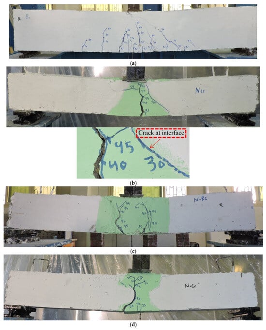 The failure patterns of the tested specimens are depicted in Figure 5, Figure 6, Figure 7 and Figure 8. For beam B0, the initial crack emerged at 32 kN, at approximately 52% of its ultimate load. This crack propagated upward toward the loading cell as the load continued to increase (see Figure 5a). The width of the primary flexural cracks expanded, becoming the predominant cause of failure for the beam, which ultimately failed at 62 kN. In the case of specimen N-tr, the first crack appeared at 31 kN, about 62% of its ultimate load (Pu), and was located at the bottom of the tensile zone. As the load increased, the crack widened and progressed toward the loading cell. In addition, a crack developed at the interface of the connecting region (see Figure 5b). The specimen failed at 50 kN. For specimen N-rec, initial cracking occurred at 35 kN, around 58% of its Pu. The superior stress transfer characteristic of this connection type delayed crack initiation compared to other connection types. Two major cracks originating from the bottom tensile zone advanced toward the loading cell as the load increased. Specimen N-cr exhibited an earlier onset of the first crack at 29 kN, about 56% of its ultimate load, compared to other connection types. As shown in Figure 5d, the crack developed at the interface of the connection, which became the weakest zone as the crack widened under an increased load.
