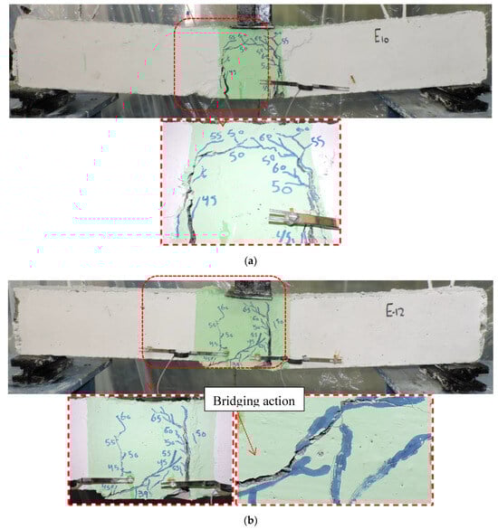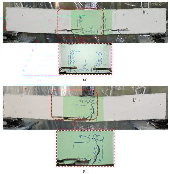As shown in Figure 6, beams with UHPECC demonstrated significantly improved failure patterns compared to beams in Group G-N. Small, tightly spaced hairline cracks appeared at the cracking load. For specimens U-10 and U-12, the initial cracks emerged at loads of 45 kN and 50 kN, respectively, representing increases of 41% and 56% compared to B0. At 70 kN, specimen U-12 exhibited some concrete spalling in the tensile zone. This group of beams showed the most significant improvement in failure pattern among all tested groups.