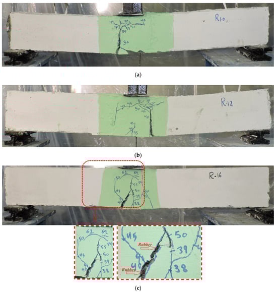 The failure mode of beams of Group G-RE: (a) beam R-10; (b) beam R-12; and (c) beam R-16.
