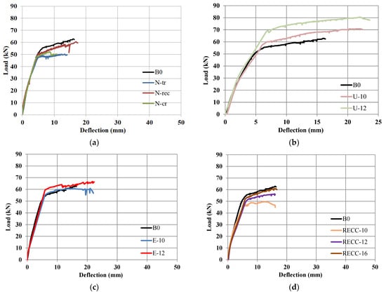 Load-mid-span deflection: (a) Group G-N; (b) Group G-U; (c) Group G-E; and (d) Group G-RE.