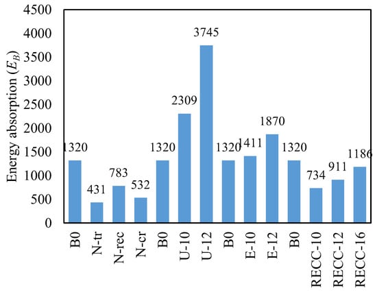 Energy absorption capacity, calculated as the area under the load-displacement curves, indicates the ability of a specimen to absorb and dissipate energy during loading, as shown in Figure 10. This parameter is crucial for evaluating the toughness and ductility of structural elements. For specimens in Group G-N, the energy absorption capacities of N-tr, N-rec, and N-cr were significantly lower than that of the control beam B0, at 33%, 59%, and 40%, respectively. This reduced energy absorption suggests that the intermediate connection types in Group G-N are less effective in dissipating energy, resulting in a more brittle failure. Similarly, Group G-RE specimens exhibited lower energy absorption capacities compared to B0. Specifically, RECC-10, RECC-12, and RECC-16 absorbed 56%, 69%, and 90% of the energy absorbed by B0, respectively. The reduced energy absorption in these specimens highlights the limited ductility and energy dissipation capabilities of rubberized ECC under loading. Conversely, the specimens filled with UHPCECC in Group G-U showed significant improvements in energy absorption. U-10 and U-12 exhibited energy absorption increases of 75% and 184%, respectively, compared to B0. This substantial enhancement can be attributed to the superior mechanical properties of UHPCECC, which provide greater resistance to crack propagation and allow for higher energy dissipation.