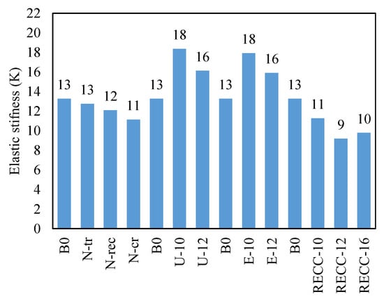 Elastic stiffness, calculated as the slope of the initial linear portion of the load-displacement curve, reflects the specimen’s resistance to elastic deformation under loading and is shown in Figure 11. In Group G-N, the elastic stiffness values of N-tr, N-rec, and N-cr were 4%, 9%, and 16% lower than that of B0, respectively. This reduction indicates that these intermediate connection shapes offer less resistance to initial deformation, leading to a more flexible response under loading. For specimens in Group G-RE, the elastic stiffness values of RECC-10, RECC-12, and RECC-16 were 15%, 31%, and 26% lower than that of B0, respectively. The decreased stiffness in these specimens suggests that rubberized ECC reduces the overall rigidity of the beams, resulting in greater initial deformation under load. In contrast, the specimens filled with UHPCECC in Group G-U showed higher elastic stiffness compared to B0. U-10 and U-12 exhibited increases of 38% and 21% in elastic stiffness, respectively. The higher stiffness in these specimens is attributed to the superior mechanical properties of UHPCECC, which enhance the specimen’s resistance to initial deformation. Similarly, in Group G-E, specimens E-10 and E-12 exhibited increases in elastic stiffness of 35% and 20%, respectively, compared to B0. The higher stiffness in these specimens is due to the increased tensile bar diameter and the mechanical properties of ECC, which provide greater resistance to elastic deformation.