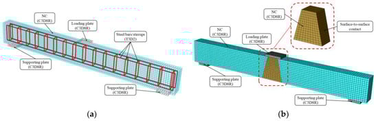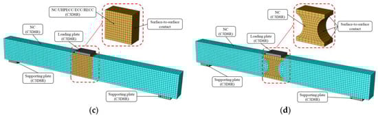 To accurately recreate the experimental conditions, the numerical simulation aimed to generate reliable results regarding the behavior of the investigated PRRC beams. Eight-node linear reduced integration solid elements (C3D8R) were utilized to model all the concrete components, including NC, ECC, UHPCECC, and RECC. These elements were chosen for their capability to capture the complex nonlinearities of concrete under various loading conditions. Two-node linear 3D truss elements (T3D2) were employed to simulate the steel reinforcement bars and stirrups. This element type accurately models the uniaxial behavior of steel, including both tensile and compressive responses. A three-point loading scheme was implemented in the FEM model to replicate the experimental setup. The load was applied through a reference point linked to a rigid loading plate, which mirrored the setup used in the physical experiments (see Figure 12). The boundary conditions that were applied accurately replicated the experimental constraints (pinned support) by preventing vertical movement but allowing rotational moment. Boundary conditions were applied to the reference points attached to the loading plates through coupling constraints.