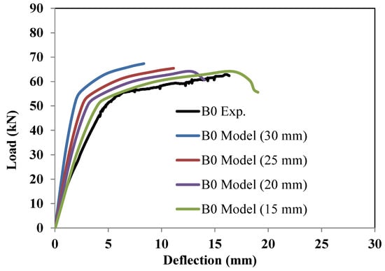 The interaction between the concrete and its steel reinforcement was modeled using an embedded-region approach. In this model, concrete was considered as the host material, with steel reinforcement embedded within it. This modeling approach realistically captures the bond behavior between concrete and steel, which is crucial for accurate load transfer and structural performance. For simulating the interactions between different concrete materials (NC/ECC, UHPECC, RECC), a surface-to-surface contact approach was used. A friction coefficient of 0.6 was applied in the tangential direction to account for frictional resistance during potential sliding between different concrete materials, based on a previous study of precast beams with intermediate connections, as carried out by the authors []. Hard contact was assumed in the normal direction to prevent material penetration, ensuring a realistic simulation of the material interactions. The adopted interaction modeling was found to accurately reflect the performance of precast beams with intermediate connections under flexural load, as carried out by the authors []. A full-bond condition was applied between the concrete beam and the loading and supporting plates. This modeling choice ensures a strong connection at these interfaces, allowing for accurate force transfer and reflecting the actual behavior of the structural elements during loading. Based on the sensitivity analysis illustrated in Figure 13, a mesh size of 15 mm was adopted for modeling the PRRC beams.