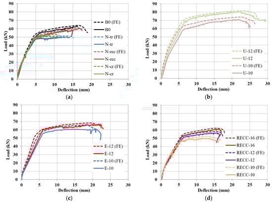 Experimental observation vs. the FEM load mid-span deflection predictions of (a) Group GN; (b) Group GU; (c) Group GE; and (d) Group RECC.