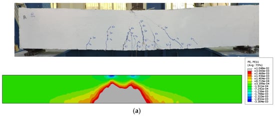 Experimental observation vs. the FEM failure modes predictions of (a) beam B0; (b) beam N-tr; (c) beam N-cr; and (d) beam E-10.