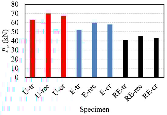 Following validation, the FEM was extended to conduct a parametric study to explore the influence of shape configuration (triangular, rectangular, and semi-circular) in the case of UHPECCC, ECC, and RECC-filled concrete. Table 6 lists the summary of the parameters of the analyzed beams. The effects of concrete types on the shapes of the intermediate connections are shown in Figure 16, where it is seen that when UHPECC was used, the rectangular-shaped intermediate connection resulted in a higher ultimate load than the other shapes, which is consistent with the NC performance observed in the test results. However, for intermediate connections filled with ECC and RECC, semi-circular-shaped connections provided higher strength, followed by rectangular- and triangular-shaped intermediate connections. When compared to the test results for N-tr, N-rec, and N-cr beams with NC reported in this study, it is evident that using UHPECC resulted in an increase in the ultimate load of N-tr, N-rec, and N-cr by 26%, 17%, and 29%, respectively. Similarly, for ECC-filled intermediate connections, N-tr, N-rec, and N-cr experienced an increase in their ultimate load by 4%, 0%, and 12%, respectively. However, when the intermediate connection was filled with RECC, the ultimate load of N-tr, N-rec, and N-cr decreased by 18%, 25%, and 17%, respectively, which is consistent with test observations.