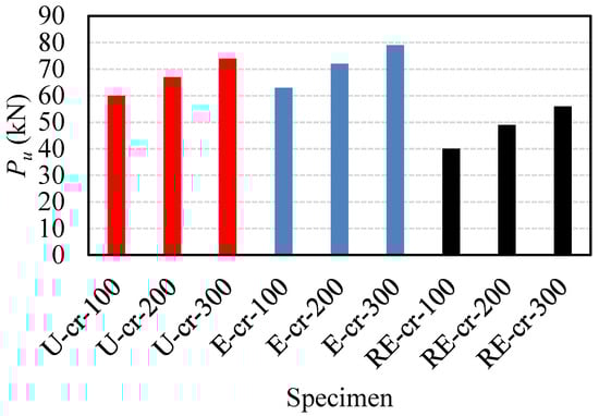 Considering a semi-circular-shaped intermediate connection generally provides a higher ultimate load than triangular-shaped intermediate connections, this study further examines the effects of the length of intermediate connection of semi-circular-shaped configuration for various types of concrete used to fill the connections. As seen in Figure 17, increasing the length of the intermediate connection increased the ultimate load of the beams. Increasing the length of the intermediate connection from 100 to 200 and 300 mm resulted in an increase in the ultimate load by 12% and 23% for UHPECC, 14% and 25% for ECC, and 23% and 40% for RECC, respectively. Therefore, for connections filled with RECC, it is recommended that a greater length of intermediate connection should be used to improve the ultimate load of the beams.