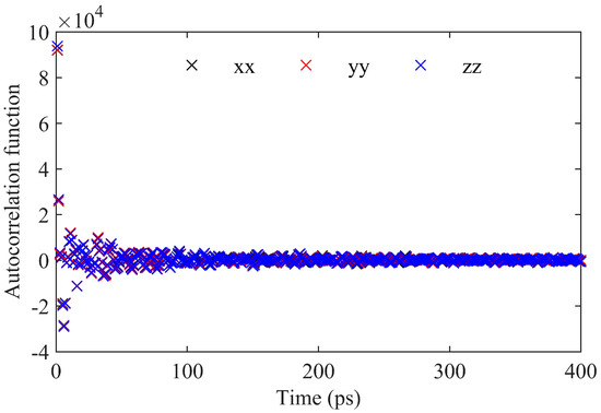 where represents the system volume, is the Boltzmann constant, is the temperature, is the sampling interval, is the integration time, denotes the off-diagonal elements of the pressure tensor, and denotes the ensemble average [24]. In theory, the autocorrelation function decays to zero over a long time (Figure 1), and the integration in Equation (1) reaches a constant value, corresponding to the calculated viscosity.