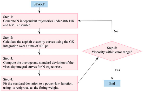 During the simulation, intense pressure fluctuations and the accumulation of computational errors make it difficult to determine the plateau value for viscosity estimation from a single calculation, especially for high-viscosity polymers. To obtain reliable results, the viscosity of asphalt is calculated according to the following steps, and the flowchart can be seen in Figure 2.