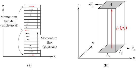 The black arrows in Figure 3a represent the velocity gradient and direction caused by momentum exchange at both ends. When the periodic transfer of momentum is repeated, the total exchanged momentum after a simulation time t is . Therefore, the momentum flux can be expressed as follows:
