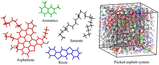 - Li, D.D.; Greenfield, M.L. Chemical compositions of improved model asphalt systems for molecular simulations. Fuel 2014, 115, 347–356. [Google Scholar] [CrossRef]