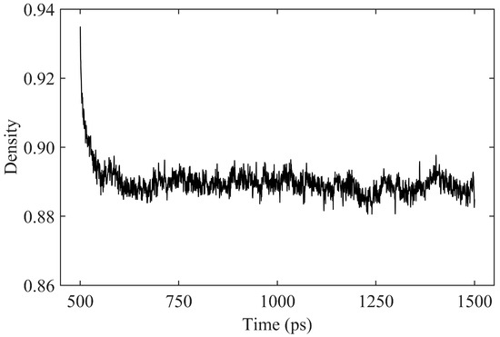 For the established asphalt molecular model, it is essential to initially compare it with experimental results to ensure the reliability of the outcomes. At present, in MD simulations, parameters used to validate asphalt models primarily include density [36], solubility parameters [37,38], atomic radial distribution functions, and glass transition temperatures [39]. Among these, density is the most common indicator to assess the model reasonableness, which can be obtained through relaxation in the NPT ensemble [10]. Generally, it is considered reasonable if the error between simulated and measured asphalt density falls within a 5% range, indicating the rational construction of the model [40]. The initial pristine asphalt density was set at 1.00 g/cm3, and the assembled model underwent structural optimization through an energy minimization process. At a temperature of 408.15 K, the model was sequentially relaxed for 500 ps and 1000 ps in the NVT ensemble and then in the NPT ensemble to eliminate initial configuration internal stresses [41,42]. Figure 5 illustrates the change in density over time between 500 ps and 1500 ps, and it can be clearly seen that the asphalt density gradually stabilizes during the relaxation process, ultimately reaching 0.891 g/cm3.