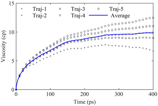 Viscosity is a collective property that cannot be improved in statistical accuracy by averaging all particles in the system. Therefore, when using the GK method to calculate viscosity, obtaining reliable data typically requires longer integral trajectories. However, in a single simulation, the low sample count and large fluctuations in the long-time autocorrelation function of pressure result in inconsistent integral plateaus for the same asphalt model in multiple calculations. Figure 7 provides an example of using the GK integral in viscosity calculation, generating five independent curves at 408.15 K for a duration of 400 ps. It can be observed that the five integral curves deviate from each other and fail to converge to the same value, with discrepancies becoming more pronounced at longer times. Furthermore, even if a stable region of the curve is identified, there is no unified standard for determining the viscosity value reasonably. Currently, researchers have different methods to address this issue. Zhang et al. [15] extracted a value from the first plateau of the integral curve after system relaxation. Li and Greenfield [46] studied asphalt viscosity using the GK method and took the average value of a specific region in the integral as an estimate. Van-Oanh et al. [47] adopted the method of averaging multiple calculations to smooth the integral curve but did not specify how to determine the estimated value. It should be noted that these methods may yield different viscosities for the same integral curve. Thus, a reasonable approach is to run multiple independent trajectories in parallel and average the integrals to reduce errors from a single simulation, as shown in Figure 7. Considering the availability of large-scale parallel computing servers (LAMMPS), running multiple independent trajectories not only saves computational time but is also easily achievable.