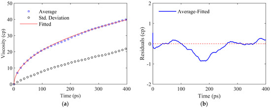 For all initial configuration models, 30 independent calculations were performed, generating 30 integral trajectories, each with a length of 400 ps. Subsequently, the average of multiple trajectories was computed, and the viscosity was calculated using the Formula (1). The average and standard deviations at 408.15 K are shown in Figure 8a. As expected, the long-term accumulation of random noise in the autocorrelation function causes the standard deviation to increase with simulation time. To ensure the validity of the results, the average integral was fitted with a double exponential function, as shown in Formula (3), and extrapolated to the limit time. Here, the weight function was used to fit the average integral, where b was obtained by fitting the standard deviation using Formula (5). Through calculation, within the finite integral time, the parameter b fitted was close to −1. Therefore, was adopted for the viscosity curve in the simulations. Figure 8b displays the residuals of the average and fitted line, indicating a good fit and a high accuracy of the fitting function.