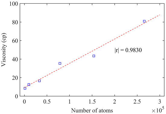 Restricted by limited computational resources, researchers commonly use smaller volume boxes for molecular dynamics simulations, which, however, is not conducive to thorough mixing of asphalt molecules [48]. It is generally believed that the more atoms, the more accurate the viscosity value obtained, while larger models often demand an incredibly high computational capacity. In order to compare the effect of the atomic number on the viscosity in MD simulations, this study established six models, as shown in Table 3. Figure 9 presents the relationship between asphalt atom count and viscosity, which reveals a strong linearity (Pearson correlation coefficient of 0.9830).