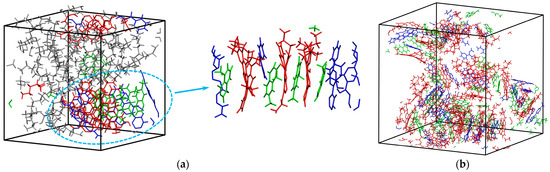 Visualizing asphalt molecules, it can be observed that an increase in the number of atoms does not lead to significant changes in the microstructure. As per Figure 10a, even the M-1 model with very few molecules also fully complies with colloid theory [49], where asphaltene is at the center, surrounded by adsorbed resins and aromatics, and saturates randomly fill the interstices as solvents. Additionally, resins and aromatics can form stacked structures around the asphaltene through π-π conjugation, thus forming larger aggregates. In Figure 10b, in the M-2 model with more molecules, the π-π conjugation effect is similarly evident, and the increase in molecular number leads to larger and more dispersed stacks.
