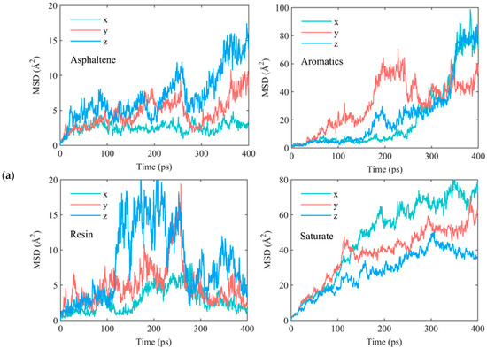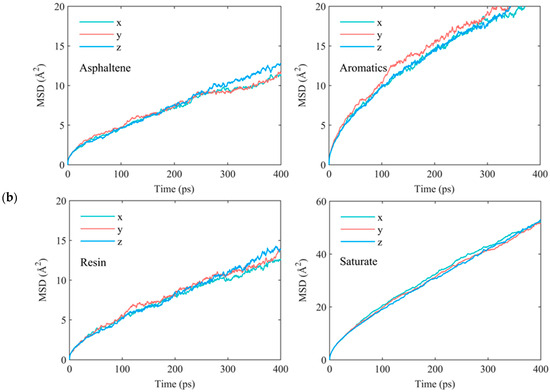 According to the results of the mean square displacement (MSD) components in Figure 11a, molecules in the M-1 exhibit significant fluctuations in displacement. Meanwhile, Figure 11b shows that the difference in displacement of molecules in the three directions decreases in the larger M-6 model, indicating enhanced isotropy of the molecular system. The results suggest that the viscosity of asphalt calculated using the M-6 model is smoother, with less directional variation. Li et al. [45] have suggested using models with an atom count between 260,000 and 375,000 to analyze asphalt viscosity, which is consistent with the results of this study.