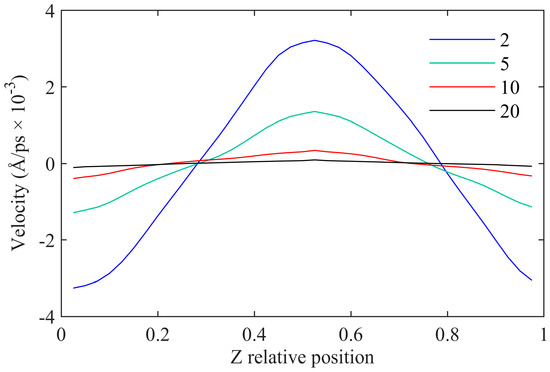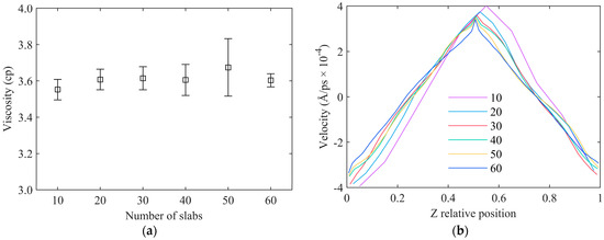 where and are the x-components of the exchanged momenta in regions 1 and M, respectively. As shown in Figure 3b, and are the lengths of the simulation box in the x and y directions, is the area through which momentum is being exchanged, and 2 in the denominator arises from the periodicity of momentum exchange. When non-physical momentum transfer occurs between the first and center slabs, the system balances this momentum flow by physical friction, causing it to flow in the opposite direction [22]. Once a steady state is reached, the rate of non-physical momentum exchange is counteracted by the rate at which momentum flows back through friction, resulting in a uniform and approximately linear velocity distribution in the z-direction. This balanced state ensures the stable transfer of momentum within the system [31].