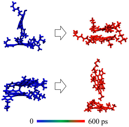 The rNEMD method divides the simulation system into multiple (even) subregions in the z-direction, so determining the number of subregions is the first step in calculating viscosity. Here, the simulation box was divided into 10, 20, 30, 40, 50, and 60 different numbers of regions. Figure 12a illustrates the influence of the subregion numbers on the shear viscosity of asphalt. It can be observed that the viscosities calculated with different regions vary little, with a relative error of approximately 1.02%, allowing the error due to this variable to be neglected. The corresponding velocity distribution curves are shown in Figure 12b, where it can be seen that fewer divisions (10, 20, and 30) result in a deviation of velocity distribution relative to the middle position and different velocity gradients appearing on either side. Simultaneously, too few region divisions can lead to a lower number of sampling points, resulting in a poor linear determination coefficient. On the other hand, too many region divisions may cause the thickness of the plates to be smaller than the geometric size of asphalt molecules, which can affect the statistical independence between different divided regions and lead to significant non-linearity in the middle and at both ends of the curve. According to Formula (6), since the momentum flux is known, the shear viscosity can be directly calculated from the uniform velocity gradient. In the face of this situation, consideration of the influence of the non-linear shear strain field is required during calculation and increases the complexity. Based on the above analysis, the entire system was divided into 40 regions in the z-direction, with each region having a thickness of 3.75 Å, which can be used for subsequent simulations. As shown in Figure 13, from the perspective of configuration, the aggregation behavior of asphaltene molecules constantly changes between face-to-face stacking, offset stacking, and T-shaped stacking, and their planes do not clearly face the direction of shear flow but rather undergo translational or rolling motion with shear flow.