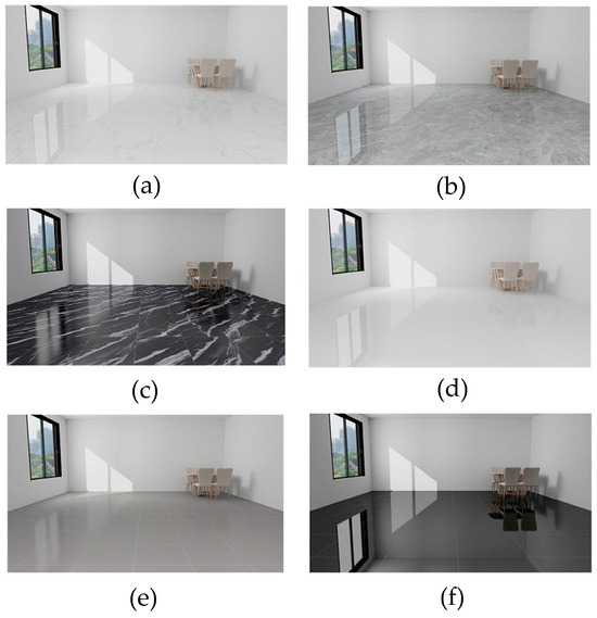The experimental materials used in this study were created using 3D software (Kujiale, China). Given the wide variety of design features of ceramic tiles, the need for a reasonable number of survey questions, and the generalizability of the results, two commonly noted design variables—brightness and texture—were selected as independent variables to assess the visual comfort of ceramic tile design. This choice is supported by Artacho et al., who found that texture and brightness significantly affect the visual perception of ceramic tiles [9]. Agost and Vergara discovered that light-toned tiles are associated with pleasant feelings [11]. The authors’ previous research established a relationship between tile brightness and aesthetic preference, indicating that people have the highest aesthetic preference for light-toned tiles, a second-highest preference for medium-toned tiles, and the lowest preference for dark-toned tiles [15]. Therefore, in this study, the brightness factor of the ceramic tiles was divided into three levels: light-toned, medium-toned, and dark-toned. The texture variable was divided into two levels: textured and non-textured. To achieve a two-factor multilevel experimental design, six images of ceramic tiles were rendered, representing the three levels of brightness and two levels of texture (3 × 2). As this experiment primarily focused on the visual comfort of ceramic tiles, other environmental elements in the experimental materials, such as lighting, furniture, and windows, were kept constant, as illustrated in Figure 1.