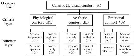 Based on the evaluation indices for the physiological comfort dimension from previous similar studies [11,31,34] and expert evaluations in this study, the indicators for the physiological comfort dimension (B1) of the ceramic tile visual comfort (A) were the sense of temperature (C1), sense of brightness (C2), sense of space (C3), and sense of vitality (C4). According to the evaluation indices for aesthetic in previous research [11,35] and expert evaluations of this study, the indicators for the aesthetic comfort dimension (B2) were the sense of order (C5), sense of beauty (C6), sense of refinement (C7), and sense of cleanliness (C8). The emotional quality of ceramic tiles can contribute to emotional comfort [32]. Combining emotional evaluation indicators from previous research [11,16,31,36] with expert evaluations from this study, the indicators for the emotional comfort dimension (B3) were the sense of pleasure (C9), sense of intimacy (C10), sense of calm (C11), and sense of relaxation (C12).