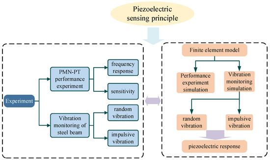 In this study, an external sensor is designed using piezoelectric single crystal (PMN-PT) to monitor the stress state of steel beams under low-frequency load. The sensor has the characteristics of high sensitivity, comprehensive frequency response, fast response speed, and good electromechanical coupling performance [35]. Subsequently, the performance characterization of the sensor and the stress monitoring test under random vibration load and impact load were carried out on the scale-I-shaped steel beam bonded with the PMN-PT sensor. At the same time, combined with the COMSOL finite element simulation results, the feasibility and accuracy of the sensor for the health monitoring of steel members were compared and verified. The full text structure framework is shown in Figure 1.
