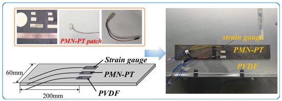 The test component utilizes a fixed steel plate with dimensions of 400 mm × 60 mm × 3 mm at both ends. The piezoelectric-sensitive element of the PMN-PT sensor is the 001-cut lead magnesium niobate-lead titanate (PMN-PT) material developed by the research group. The specific size is 20 mm × 10 mm × 0.5 mm. The piezoelectric single crystal wafer is plated with silver and pasted with a wire. Following completion of the welding process, a regular epoxy resin protective layer is applied to the upper and lower electrode surfaces to prevent the wire from disconnecting in practical applications. The PMN-PT sensor is prepared by allowing it to stand for 24 h at room temperature. The resistance strain gauge, PMN-PT sensor, and PVDF sensor are affixed to the surface of the steel plate at equal distances, as illustrated in Figure 3. The HK-9209 charge amplifier and DH-5922D data acquisition instrument are connected to the wire of the sensor to collect the voltage signal during the test.