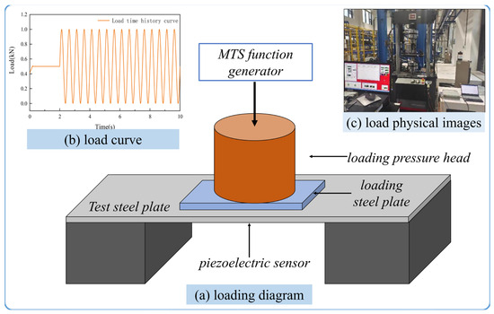 In order to ascertain the sensitivity performance level of the sensor, a sensitivity calibration test was conducted. The MTS function generator was employed to apply a fixed frequency sine wave load. The MTS universal testing machine was equipped with a built-in force sensor. The sensitivity index of the sensor was determined by fitting the stress–strain data obtained from feedback with the output voltage of the PMN-PT sensor. The test-loading device is depicted in Figure 4.