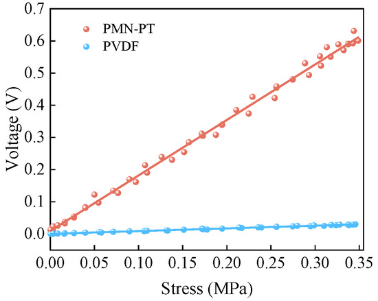 As illustrated in Figure 6, the structural stress of the piezoelectric sensor and the output voltage signal of the corresponding piezoelectric sensor are subjected to a linear fit. The outcomes demonstrate that during the dynamic loading process, the output voltage values of the two sensors exhibit a high degree of linear correlation with the structural stress values. Concurrently, when the thickness of the adhesive layer is 0.5 mm, the sensitivity of the PMN-PT piezoelectric sensor is 1.721 V/MPa, with an R2 of 0.975 following linear fitting. The sensitivity of the PMN-PT sensor is 0.084 V/MPa, with an R2 of 0.965. It is evident that the sensitivity of the PMN-PT sensor is considerably higher than that of the PVDF sensor. This indicates that the PMN-PT sensor exhibits a faster response speed and a more stable output signal under the same load environment. Furthermore, the piezoelectric response performance of the PMN-PT sensor is markedly superior to that of the PVDF sensor, rendering it a more suitable choice for structural dynamic monitoring.