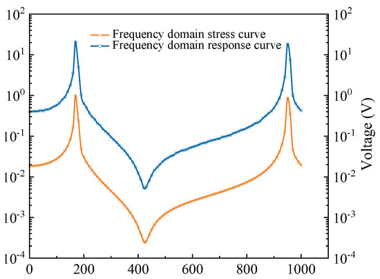 In this experiment, the steel beam member is preloaded with an amplitude of 0.3 kN and a duration of 2 s in order to eliminate the test error caused by the gap between the members. Once the beam has stabilized, a sinusoidal wave load with an amplitude of 0.5 kN is applied and the duration is 10 s. The frequency domain response curve of the voltage output signal is depicted in Figure 7. It is evident that the stress curve is in alignment with the frequency domain response curve throughout the test. In the low-frequency region, as the frequency increases from 0 Hz to 170 Hz, the sensor voltage output signal rises from 0.018 V to a maximum value of 0.981 V at 170 Hz, which is also the peak voltage of the piezoelectric sensor. As the frequency increases from 170 Hz to 340 Hz, the voltage exhibits a downward trend, reaching a minimum value of 2.61 × 10−4 V at approximately 340 Hz. In the frequency range of 340 Hz to 950 Hz, the voltage signal exhibits a second peak of 0.849 V, following a climb from 2.61 × 10−4 V. In the frequency range of 950 Hz to 1000 Hz, the voltage signal is continuously attenuated to 0.019 V, and the curve generally exhibits an up-down-up-down trend. In the process of sweeping frequency loading, the output signal value of the sensor exhibits a strong linear relationship with the stress value. This indicates that the sensor has good performance and is capable of generating accurate electrical signal responses in response to changes in stress, reflecting the internal stress state of the structure. Concomitantly, the fluctuation of the electrical signal response in the low-frequency region of the PMN-PT sensor is markedly greater than that in the high-frequency region. This indicates that the PMN-PT sensor is more susceptible to frequency change in the low-frequency region, which is consistent with the characteristics of the piezoelectric material suitable for high-frequency measurement.