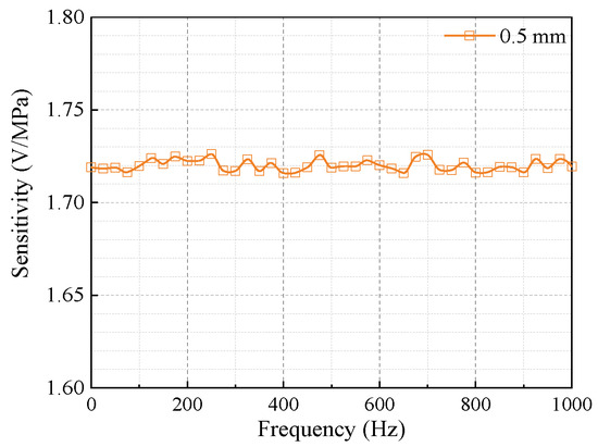 In practical structural health monitoring applications, the performance level of the sensor is determined to a greater extent by the stability of its sensitivity. In order to explore the stability of the PMN-PT sensor in different vibration frequency environments, the structural stress and output voltage were fitted, and the sensitivity curves of the sensor at different frequencies under a 0.5 mm paste layer were obtained, as shown in Figure 8. In the low-frequency range, the sensitivity of the sensor remains relatively stable, with an average sensitivity value of 1.718 V/MPa. As the frequency increases, the sensitivity of the sensor fluctuates to a certain extent. However, the overall sensitivity remains within the range of 1.716 V/MPa to 1.726 V/MPa, demonstrating the alternating rise and fall characteristic. The maximum error observed in the sensitivity calibration test was 0.29%, indicating that the PMN-PT sensor exhibits a relatively stable sensitivity in the frequency range of 0 Hz to 1000 Hz in practical engineering applications. This sensor exhibits good working performance and can be employed for structural stress monitoring.