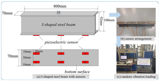 The aim of this study is to investigate the reliability of a PMN-PT piezoelectric sensor in the presence of random vibration. To this end, a stress monitoring test was conducted on a steel beam structure subjected to random vibration. The test piece was a Q235 steel beam with Young’s modulus of 200 GPa. The overall length of the steel beam was 800 mm, with a flange width of 70 mm, and the thickness was 4 mm. The web thickness is 4 mm and the height is 92 mm. The PMN-PT piezoelectric sensor is affixed to the I-steel beam through the use of epoxy resin. The sensor dimensions are 20 mm × 10 mm × 0.5 mm. The dimensions of the steel beam and the placement of the sensor are illustrated in Figure 9. The MTS universal testing machine is employed to apply a random load to the I-beam, with the electrical signal being converted by the HK-9209 charge amplifier. The signal is collected and stored by the DH-5922 D high-performance dynamic signal test and analysis system. The random excitation function, as illustrated in Figure 10, is applied to the upper surface of the mid-span of the fixed I-steel beam structure at both ends. The action time is 0~20 s, and the frequency is in the range of 0.02 Hz~55 Hz, with the majority of occurrences concentrated in the range of 2 Hz~55 Hz.