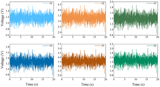 The sensor voltage time domain curve can be obtained by collecting the output signal of the sensor. As illustrated in Figure 11, the voltage–time domain curve produces a waveform consistent with the load loading curve over time and exhibits a sudden change at the same time, with the peak value occurring at 10.27 s. Table 1 presents the peak voltage output of each sensor. The peak voltage output of sensors #2 and #5 is 4.46 V and 4.81 V, respectively, which is considerably higher than the peak voltage output of the other sensors. The reason for this is that sensors #2 and #5 are situated closer to the load application position, namely, the mid-span section of the beam. Consequently, the stress wave generated by vibration is less consumed at this position than at other locations. There is a slight difference in the output voltage of the sensor at the same position. The output voltage of sensors #2 and #5 differs by 0.26 V, that of sensors #1 and #4 by 0.1 V, and that of sensors #3 and #6 by only 0.07 V. This is due to the differing material composition of the lower flange of the I-steel beam, which affects the conduction of stress waves within the steel beam. It is evident that in a random vibration environment, the voltage output signal of the PMN-PT sensor can correspond to the applied load in real-time, and the sensitivity is high. Furthermore, it can accurately reflect the internal stress change state of the steel beam and has strong applicability.