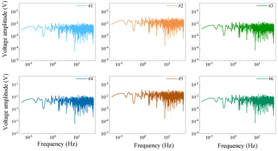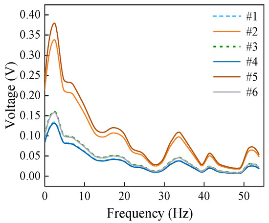 The time domain curve of the sensor is Fourier transformed to obtain the corresponding frequency domain curve. Figure 15 illustrates that the voltage amplitude of each sensor exhibits an initial increase followed by a subsequent decrease between 0 Hz and 5 Hz, reaching a maximum peak. While the voltage amplitude increases slightly in some intervals, it demonstrates a downward trend overall. Sensors #1 to #6 all exhibit a maximum peak at a frequency of 2.44 Hz. Among these, the output values of sensors #2 and #5 are notably higher than those of the other sensors, reaching 0.338 V and 0.379 V, respectively. This indicates that the low frequency of 2.44 Hz can be regarded as the main frequency of the sensor output signal. Consequently, as the frequency continues to increase, the sensor is no longer capable of generating an effective signal. The piezoelectric sensor is capable of producing a specific effective signal response in response to internal force changes of different frequencies caused by impact loads. This provides a highly practical and efficient means of monitoring the internal force changes of steel beam structures under impact load environments.