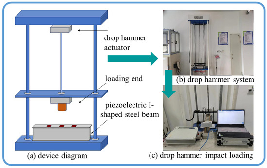 In order to study the practical effect of the PMN-PT sensor on structural health monitoring under impact load, a drop hammer impact test was designed for the I-steel beam pasted with the PMN-PT sensor. The component size and sensor paste arrangement are consistent with Figure 9. The drop hammer impact system used in the test is shown in Figure 13, which is composed of a drop hammer test machine, a 15 kg drop hammer, and a data acquisition system.