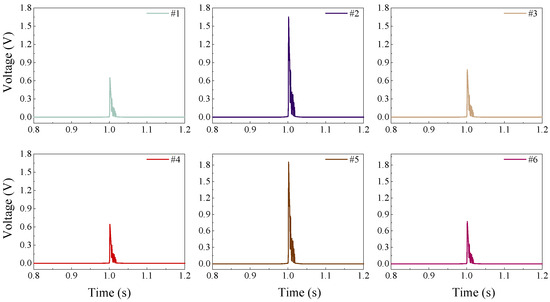The quantity of data collected by the six sensors at varying heights of impact is considerable, and the stress generated by the drop hammer impact on the surface of the steel beam is primarily contingent on the drop height. The voltage output trend of the sensor at different drop hammer heights is consistent. Consequently, this section describes the output signal curve of the piezoelectric sensor with a drop height of 20 cm as an illustrative example. In the range of 0.8–1.2 s, the drop hammer makes contact with the piezoelectric smart steel beam structure at 1 s. Figure 14 illustrates that the sensor output signal exhibits a step when the drop hammer contacts the surface of the structure, reaching a peak at 1.001 s The impact force generated by the falling hammer has a very short duration on the structure and the output signal of the sensor undergoes a sudden change when the structure is subjected to the impact. This indicates that the piezoelectric sensor has an excellent ability to perceive the impact load and can rapidly generate a voltage signal to reflect the structural stress.