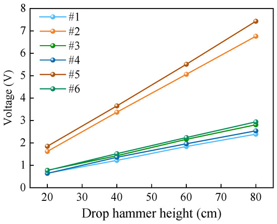 Figure 16 illustrates the drop hammer drop height (20 cm, 40 cm, 60 cm, 80 cm) in relation to the sensor voltage output peak diagram. It is evident that, under the same falling height condition, the voltage output value of sensors #2 and #5 is greater, with a difference of 10%. The voltage signals of the sensors at #1, #3, #4, and #6 are similar to those of sensors #2 and #5, with a difference of approximately one-third. This is due to the fact that sensors #2 and #5 are closer to the mid-span position. As the propagation and consumption of vibration occur, the output voltage decreases in accordance with the aforementioned position. The peak output signals of the two sensors at the same x-axis coordinates differ by 1/6. This is due to the fact that the steel material is not uniform, which results in the impact inside the steel beam not fully conforming to the law of symmetrical transmission.
