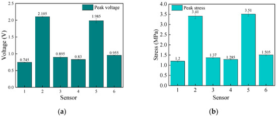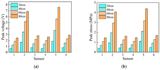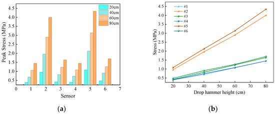 (a) Peak stress of different drop hammer height; (b) peak stress of each sensor.