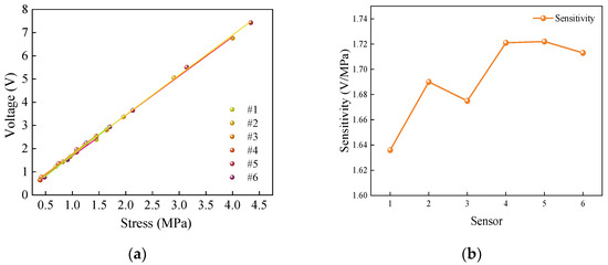 The output peak voltage signal of the PMN-PT piezoelectric sensor under drop hammer impact at different heights is fitted with the stress peak obtained by inversion calculation. The sensitivity fitting curve of each sensor is shown in Figure 18a, and Figure 18b gives the sensitivity results of #1–#6 sensors. The minimum sensitivity of the # 1 sensor is 1.636 V/MPa, the maximum sensitivity of the #5 sensor is 1.722 V/MPa, and the maximum error is 4.9%. The average sensitivity of the six sensors is 1.693 V/MPa, which is consistent with the sensitivity calibration result of 1.721 V/MPa in Section 3.2. It can be seen from Figure 17 that the sensitivity fitting linearity of #1–#6 sensors is high, indicating that PMN-PT sensors have good working performance under different impact loads and can be effectively used for steel beam structure monitoring under impact loads.