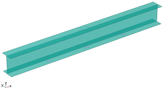 In order to verify the accuracy of the sensor response in the test, a numerical calculation model of an I-steel beam suitable for different vibration loads was established based on COMSOL 6.0 finite element software, as shown in Figure 19. The model simulation grid contains 121,703 units, with a minimum mass of 0.2957 and an average mass of 0.5692. The piezoelectric layer was constructed using PMN-PT material. The specific material parameters are presented in Table 3 and Table 4. The model sensor is positioned in accordance with Figure 8. Fixed constraints are applied at both ends of the steel beam model to simulate the consolidation form. The piezoelectric layer of the sensor is set to be in the electrostatic physical field, and the remaining layer is the solid mechanical field. The lower surface of the piezoelectric layer is grounded, and the upper surface is the terminal. Finally, the solid mechanics and electrostatic physical field are coupled through the piezoelectric effect to complete the model establishment.