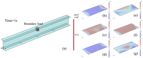 In order to verify the response law of the PMN-PT piezoelectric sensor under random excitation, a circular boundary load is applied to the local area of the surface of the I-steel beam model in order to simulate the actual loading of the load. The applied load curve is consistent with Section 4.1.1. As shown in Figure 20, Figure 20a is the steel beam model and the simulated load. Figure 20b–g illustrate the potential cloud diagram of sensors #1 to #6 at a time node of 1 s. The potential of the red area of the sensor section is positive, while the blue area is negative.