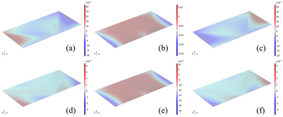 In order to verify the accuracy of the health monitoring response of the PMN-PT piezoelectric sensor under structural vibration impact, a simulation model of impact vibration is established. The loading mode is set to a step function with the same impact force as in 4.2 to simulate the actual drop hammer impact. Because the voltage change trend of the sensor at each drop hammer height is relatively consistent, the sensor characteristics at 20 cm drop hammer height are analyzed as an example. The interception time node is set to 1 s, and the sensor potential cloud map at a drop hammer height of 20 cm is shown in Figure 22. Figure 22a–f represent the potential cloud maps of sensors #1 to #6, respectively. Due to the stress change of the steel beam caused by the drop hammer impact, the positive and negative charges on the surface of the multi-layer material inside the sensor produce the opposite moving direction to form the potential difference.