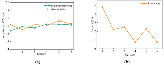 (a) Comparison of sensor sensitivity under impact vibration; (b) sensitivity error of sensor under impact vibration.