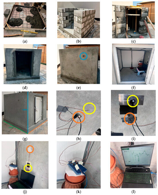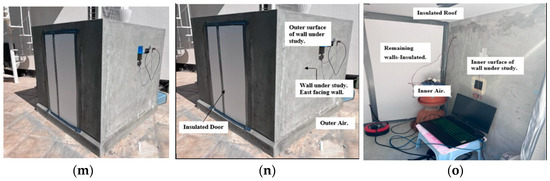 Development and description: In situ experimental model. (a) Concrete foundation. (b) Walls of model room using IMSI blocks. (c) Slab. (d) Application of 20 mm plaster on inner and outer wall surfaces. (e) Piping (blue) for wires on three walls. (f) Overall view of the room from the inner side with three walls and roof insulated using polystyrene sheets. (g) Model room with door. (h) Thermocouple mounted on outer side of east wall to measure the outer air temperature (yellow). Pipe is sealed with insulation (orange) to prevent escape of room air to the surroundings. (i) Pyranometer mounted on outer side of east wall to measure the incident solar radiations (yellow). Thermocouple (orange) mounted on east wall to measure the outer side wall temperature. (j) Thermocouples mounted on inner side of east wall to measure the inner air (yellow) and inner surface (orange) temperatures. (k) PicoLog data logger placed inside the room to log the data of the temperatures on the inner and outer sides of east wall and inner and outer air temperatures. (l) Pyranometer is connected to a laptop (placed inside the room) to collect data of the solar radiations through software every 15 min. PicoLog data logger is also connected to laptop to collect data of wall surfaces and air temperatures every 15 min. (m) Door sealed with polystyrene sheets to prevent heat loss. Final overall view of the model room during the experimentation period. (n) Final outer view of model room with required labelling. (o) Final inner view of model room with required labelling.