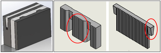 In this section, the development of a numerical model using Ansys Fluent 2021/2022 is presented. The assembly of the IMSI block with concrete and insulation parts is shown in Figure 2. To reduce complexity, the geometry of the IMSI block was simplified by neglecting some complex features (circled in red), such as the surface of the PU foam and non-perfect rectangular geometry as shown in Figure 2. The detailed SolidWorks (2021/2022) design is presented in Figure A1, Figure A2 and Figure A3.